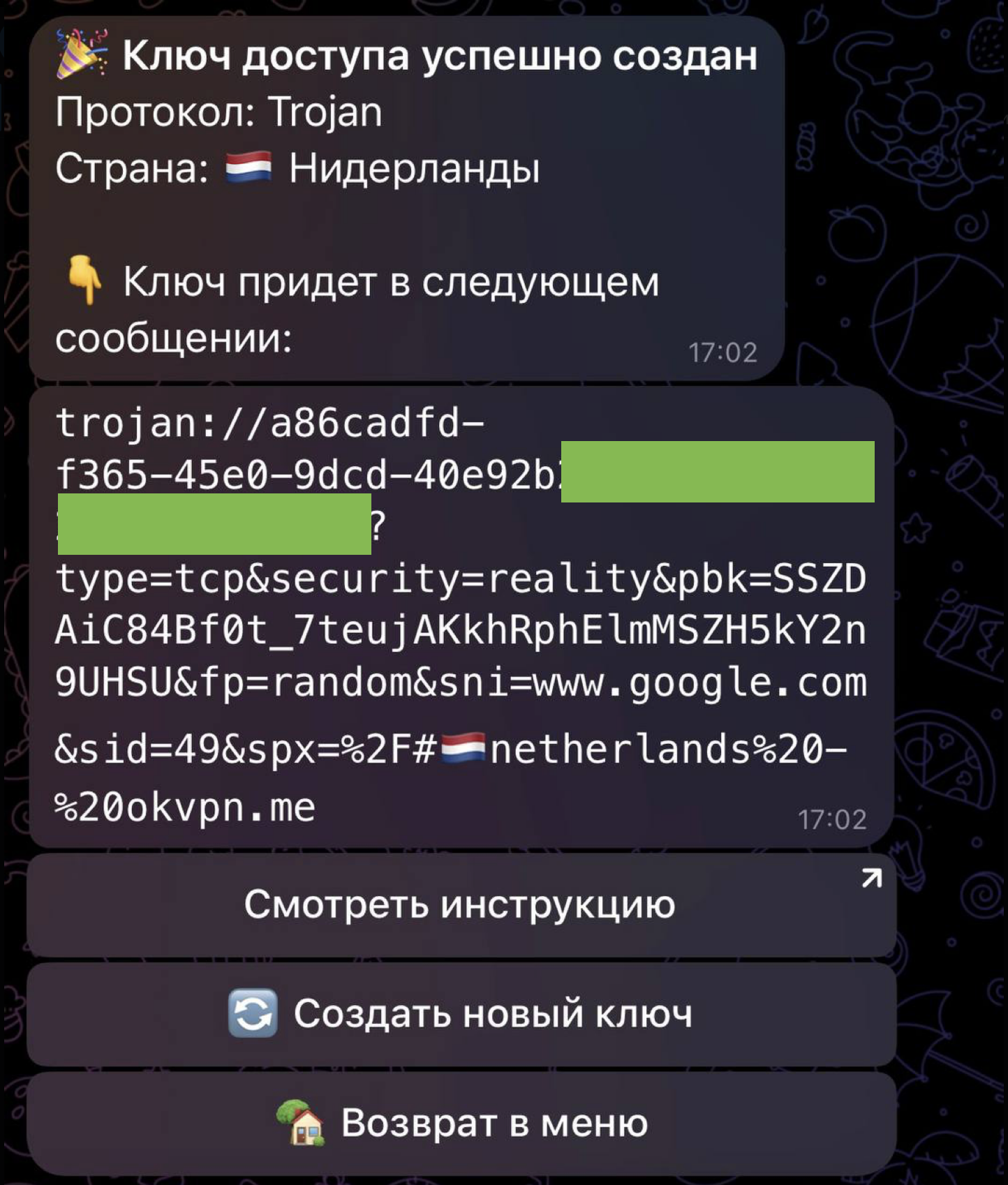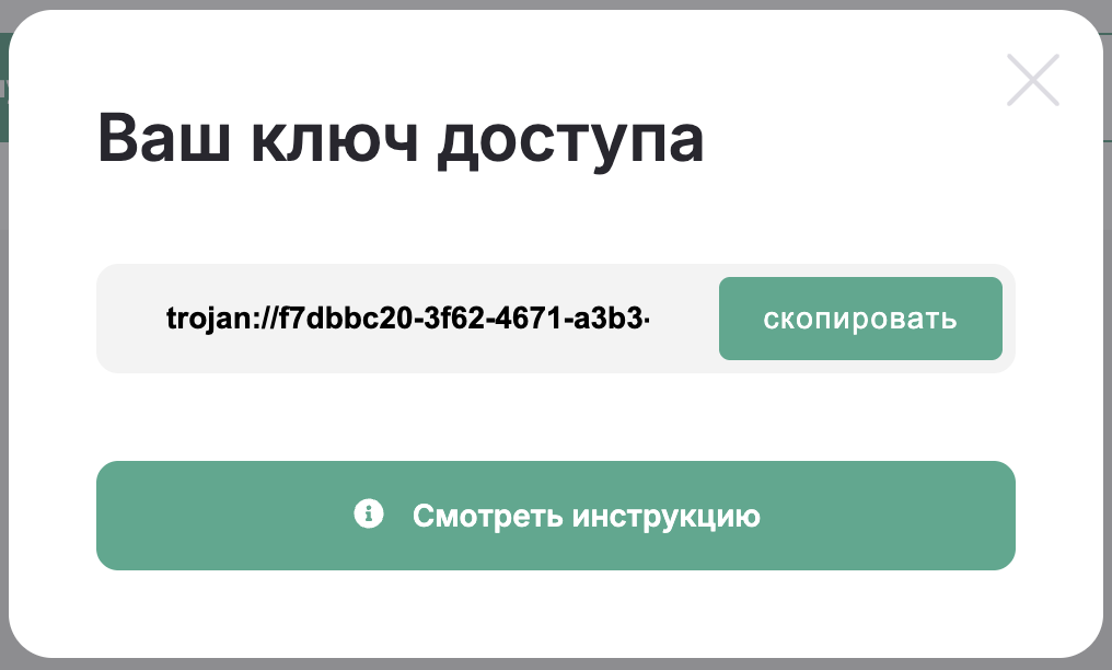 Вам нужен ключ, который выглядит как большая строка со случайными символами и начинается с trojan://. Ключ приходит после оплаты, но его всегда можно заново получить, если есть активная подписка на whitevpn
