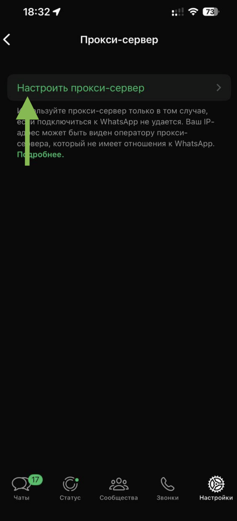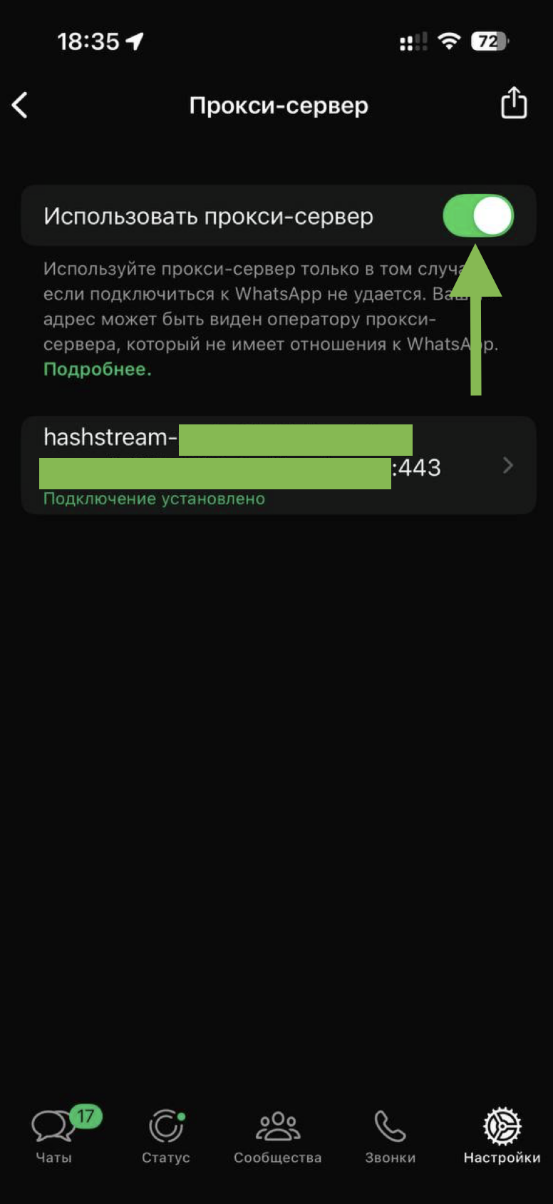 Вы успешно настроили прокси. Нажмите на кнопку «Использовать прокси-сервер», чтобы включить прокси. Прокси не нужно отключать, он будет работать только когда вы заходите в WhatsApp и используете приложение