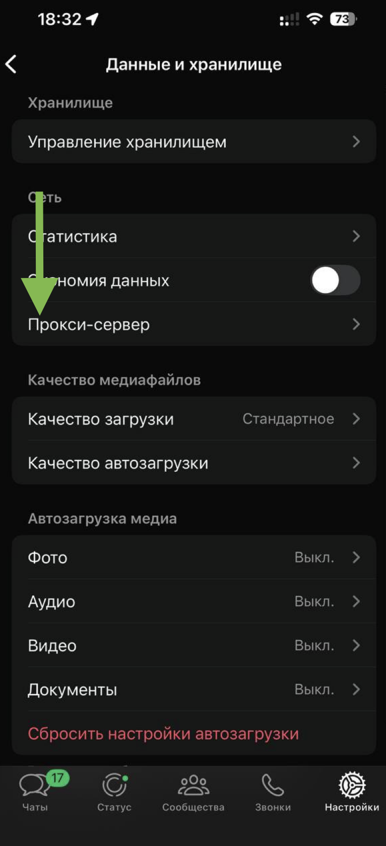 Перейдите в раздел «Данные и хранилище» -> «Прокси-сервер»