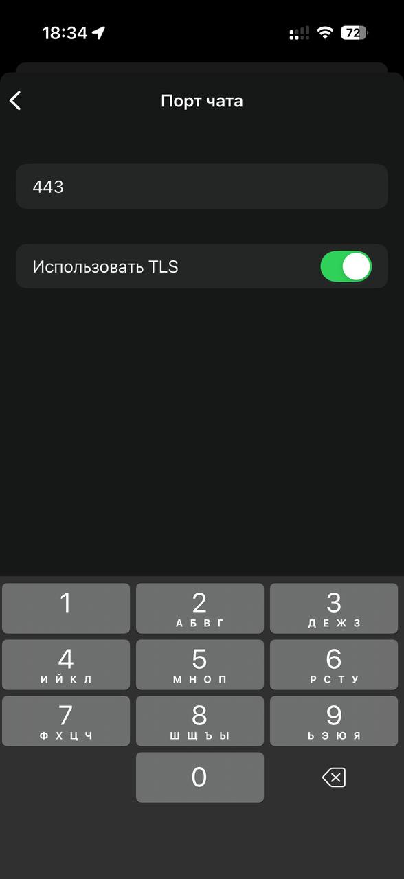 Перейдите в раздел «Порт чата». Введите порт 443 и включите «Использовать TLS»